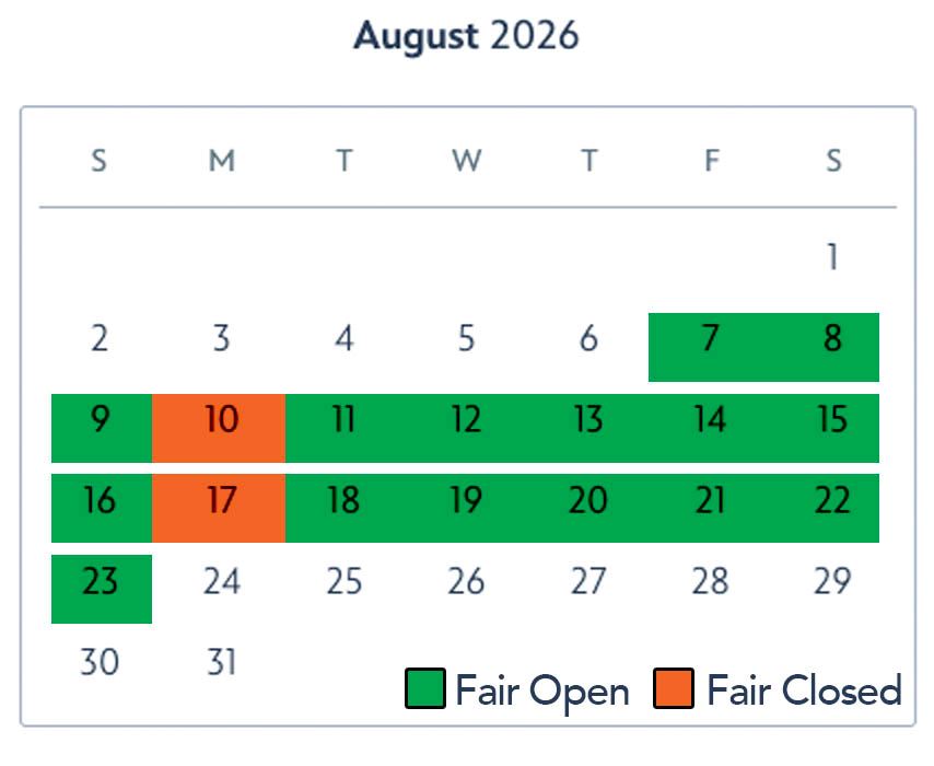 Valid only on August 7, August 12-August 14, August 19-August 21, and August 23. Not valid for Fair admission or parking. Online price includes $3.00 processing fee. No refunds. Last day to purchase is August 6.